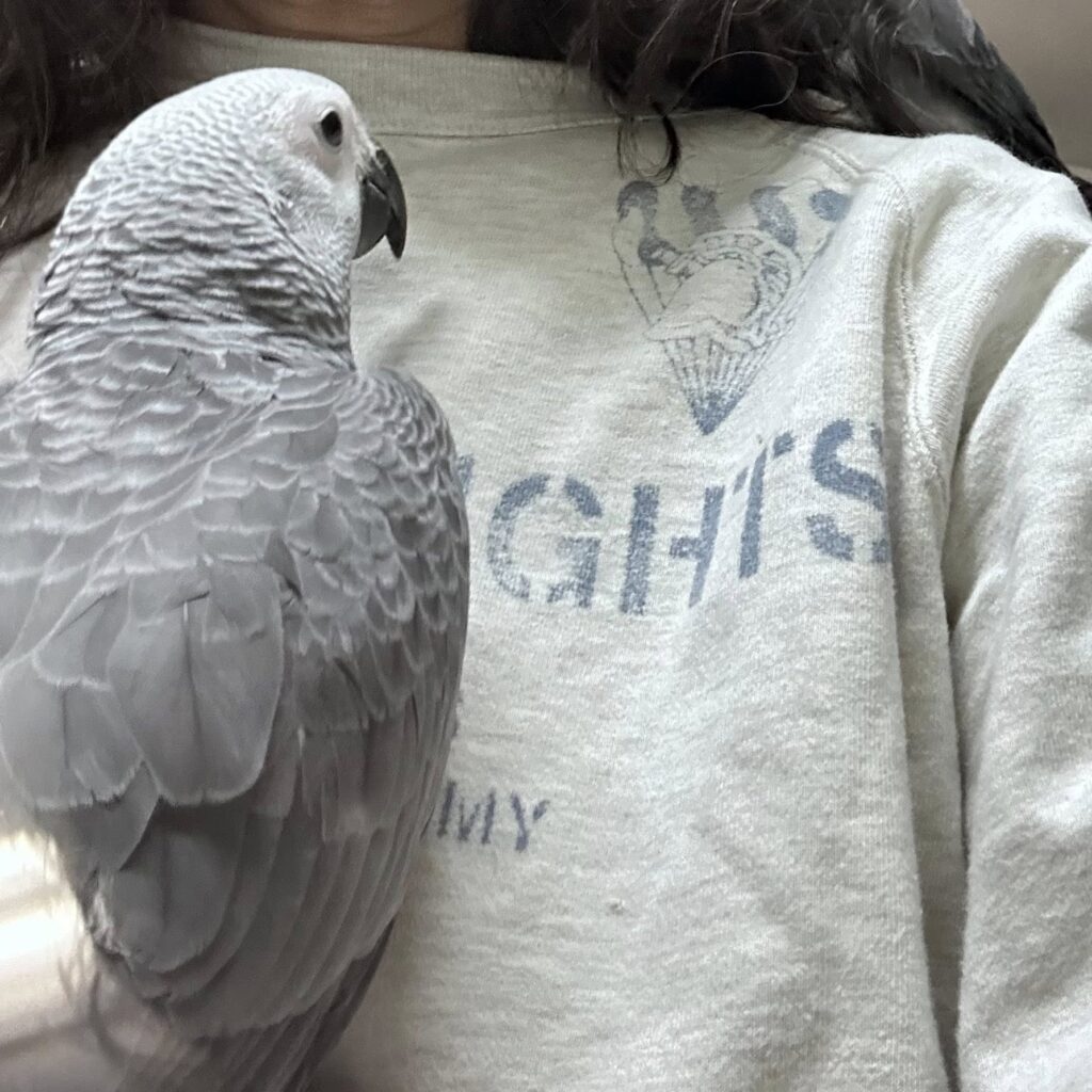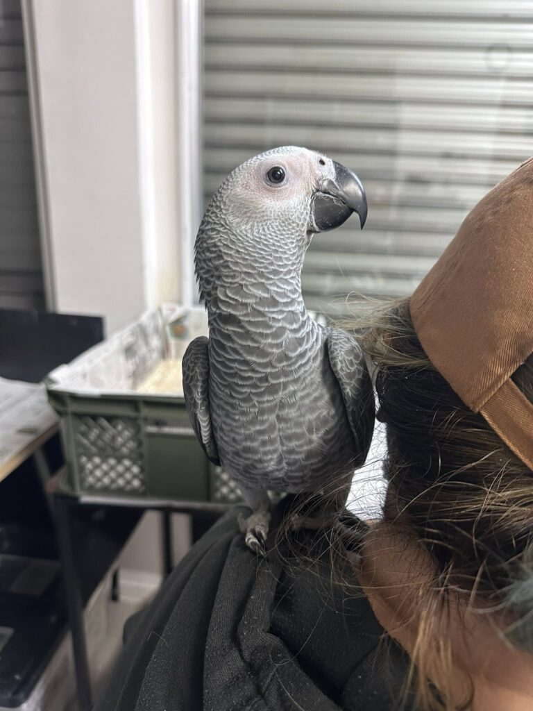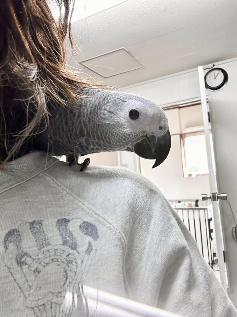 また、多くのヨウムを育ててきましたが、割と、おしゃべりに興味のある子、甘えるのが好きな子、一人で遊ぶのが好きな子と分かれることが多い中、今回の子はおしゃべりが上手になりそうでありつつ、ひとり遊びをしてみたり、呼んで抱っこしたらずっと甘えてくれたりとバランスのよい子だなという印象です。ケージからすっと出てすっと帰り、ペレットの食べ方も上手で今のところ手がかからなくてお世話がストレスにならず自信をもってオススメします。